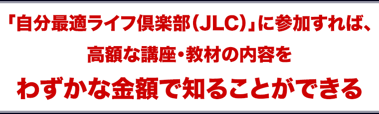 ですが、あなたは翌月無料で「自分最適ライフ倶楽部(JLC)」に参加できます。「自分最適ライフ倶楽部(JLC)」に参加すれば、高額な講座・教材の内容を、わずか9,800円(税抜)で知ることができます。今後あなたは、内容のわからない高額な講座や教材を買わなくてもよくなります。
